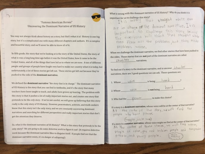 So much of what we do in fifth grade at UT Elementary is surrounding the idea of dominant and counter narratives. Students are constantly identifying dominant narratives, poking holes in those stories, and looking elsewhere to uncover counter narratives that might have something different to say. But before we can get to this place, we have to first define what a dominant narrative is. So this year, we started out with a new activity which I called our “Famous American Heroes” project.
