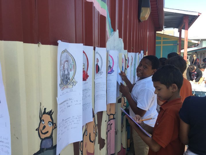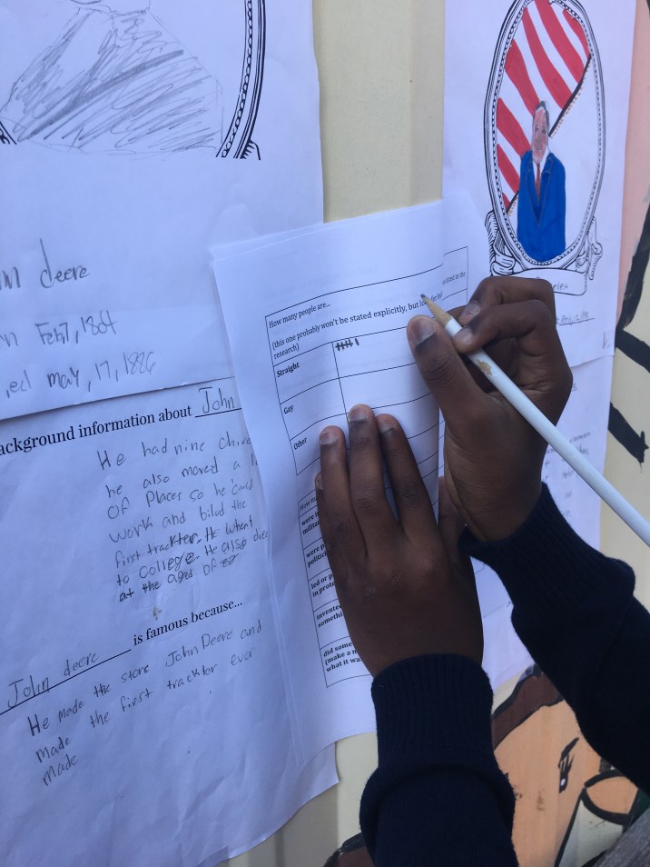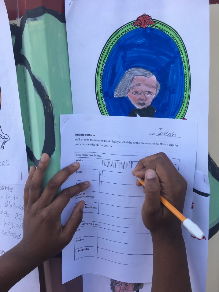 I compiled a lit of all of the people included in the fifth grade US history standards (it’s a lot of people!), and each student spent a couple of days researching one person from that list. After completing their research, students created a poster (I very strongly encouraged students to make sure the skin color marker/crayon/colored pencil they were using was as accurate as possible), and we hung all of these posters up outside of the classroom. Students then participated in a gallery walk of all of the posters, collecting data on what these people had in common.