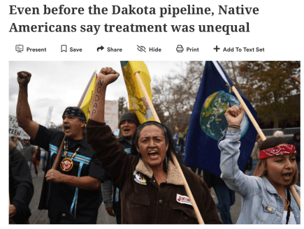 One of the most well known fights for land rights has been fought in the last few years over the Dakota Access Pipeline, an oil pipeline that was built underneath the Standing Rock reservation. Read this Newsela article to learn more about the pipeline and the treatment that Sioux Indians have faced on the Standing Rock reservation. Read the article, annotate, and submit the quiz when you’re done.